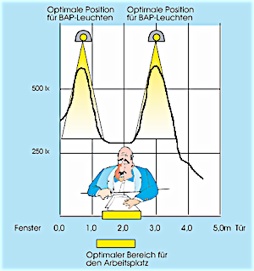 Noch viel schlimmer sieht es mit der Beleuchtung in den Büroräumen aus. Seit etwa 30 Jahren landet der größere Teil des Lichtstroms auf dem Teppich oder an den Enden der Tische. Warum das so ist, kann man aus den Leuchtendaten und den Empfehlungen für die Anordnung von Arbeitsplätzen zwischen den Leuchtenreihen einwandfrei ableiten. Man muss es aber gar nicht, man sieht es an jeder Stirnwand eines Büros. Licht bevorzugt dorthin, wo man es nicht braucht! Gegen dieses Konzept kann kein Kabarettist einen Blumentopf gewinnen, egal wie wie zynisch er auch argumentiert.