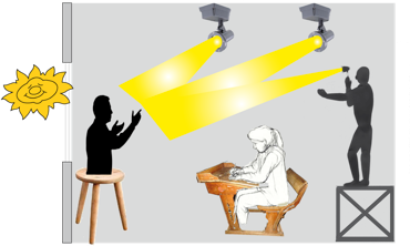 Leider machten ihm die Kollegen aus der Branche einen Strich durch die Rechnung, die nicht von ihren alten Gewohnheiten lassen konnten, und alles von oben beleuchteten, egal ob es Sinn macht oder nicht. So müssten die Schüler, die ihren Lehrer nicht so fies wie J.R. erleben wollten, so etwa 6.000 lx im Klassenraum auf ihren Köpfen genießen. Macht nix, draußen gibt es sogar 100.000 lx, sagten die Experten. Manche hantierten trotzdem mit Scheinwerfern u.ä., weil die Kinder arg schwitzten.
