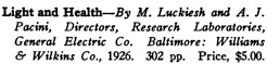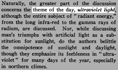 Außerdem bestraft man Wissenschaftler nicht mit solchen Mitteln. Letztlich soll sogar Galileo Galilei nach seiner Verurteilung noch ein auskömmliches Leben gehabt haben. Wissenschaftler bestraft man mit spitzen Bemerkungen über ihr Werk. Hier sieht man, wie der Rezensent Luckiesh und seinen Juniorpartner abstrafte: Sie haben sich dem „Thema des Tages“ gewidmet, Ultraviolet. Was soll´s? Andere denken, die Ernährung ist genauso wichtig.
