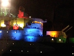 Überhaupt wird alles bunt und soft oder soft und bunt. So sah eines der fürchterlichsten Objekte, die Menschen je gestaltet haben, ein Kriegsschiff, gegen Weihnachten letzten Jahres wunderbar mild aus. Das Schiff lag - und liegt - auf der Themse. Es spielte eine große Rolle bei der Versenkung der Bismarck, allerdings als Kulisse in dem Film „Sink the Bismarck“. Bei der Versenkung der Scharnhorst hat es echt geschossen. Und am D-Day in der Normandie echt scharf. Später kämpfte es in Korea. Und nun dieses Schicksal! Touristenattraktion in Bonbonfarben. Auch die benachbarte Brücke auf der Themse konnte dem Schicksal nicht entkommen und wurde ebenfalls bonbonisiert.