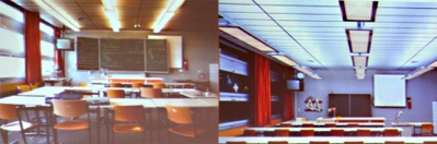 Aktiv etwas mit Licht verbessern anstelle sich mit Störungen zu beschäftigen, das hatten die Forscher vor, die 1984 nachgewiesen hatten, dass man mit künstlichem Licht die circadiane Rhythmik beim Menschen verstellen kann. Damit wollte man die Schichtarbeit, insbesondere in der Kerntechnik „sicherer“ machen. Leider wären die Mittel zu brachial, man hätte 10.000 lx in die Augen knallen müssen, damit der Mitarbeiter noch morgens um 03:00 Uhr wach bleibt. Mittlerweile ist der „Bedarf“ an Licht, die Bestrahlten wach zu halten, drastisch gesunken. Man hat sich darauf geeinigt, dass „blau“ im Licht ausreicht, wundersame Wirkungen auszulösen. Allerdings glauben wie Protagonisten wohl selbst der Story nicht, was man deutlich aus ihren Versuchsanordnungen ablesen kann. Sie verändern nämlich die ganze Gestaltung der Beleuchtung, nennen aber später nur die Lichtfarbe als Ursache der von ihnen - angeblich - festgestellten Wirkungen. (links Ausgangssituation, rechts die Testanordnung).