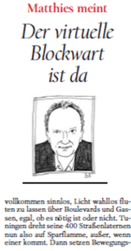 Nun vermutet der Autor Böses: „Deshalb ist die künftige Konfliktlinie auch klar. Es geht gegen die Freunde des getönten Gaslichts, die ihre Städte gern nostalgisch mögen und nicht von zackig herumblinkenden Scheinwerfern ausgeleuchtet. Der nächtliche Flaneur will in seinem Wehen und Wandern nicht verfolgt werden, man kann das verstehen.“ An seinen Ausführungen kann man ablesen, wie gründlich man den Ruf einer neuen Technologie ruiniert hat, bevor sie überhaupt entstanden ist: „Tuningen spart 82 Prozent der Stromkosten, und seine Bewohner gewinnen an Helligkeit und Sicherheit. Allerdings, das ist klar, geht das nur mit Hilfe des scheußlich kaltkranken LED-Lichts, das seine Umgebung immer so angenehm wirken lässt wie einen Operationssaal, und das ohne Narkose.“
