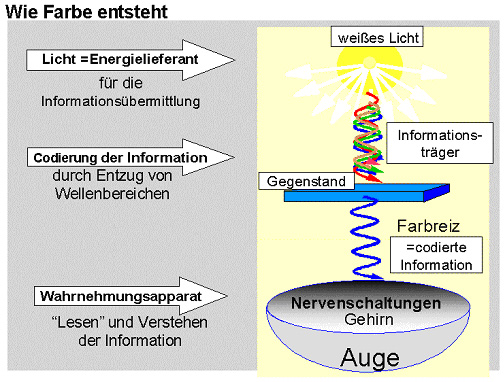 Die Farbempfindung wird im Wahrnehmungsapparat in der Regel ausgelöst durch eine Mischung von Lichtstrahlen unterschiedlicher Wellenlänge. Alle Wellenlängen zusammen, der ganze Wellensalat wird als langweiliges „weißes Rauschen“ empfunden. Erst wenn man durch Farbmittel dem Wellensalat bestimmte Wellenbereiche (absorptiv) entzieht, entsteht der Farbreiz. Erst der Mangel macht den Reiz!